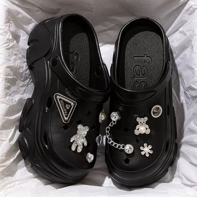 Unleash your inner rockstar with the Glam Punk Black Charm Crocs. These crocs are designed for those who dare to stand out, blending edgy style with ultimate comfort. Perfect for a variety of casual settings, these crocss feature eye-catching charms that add a funky and glamorous touch to your footwear collection.